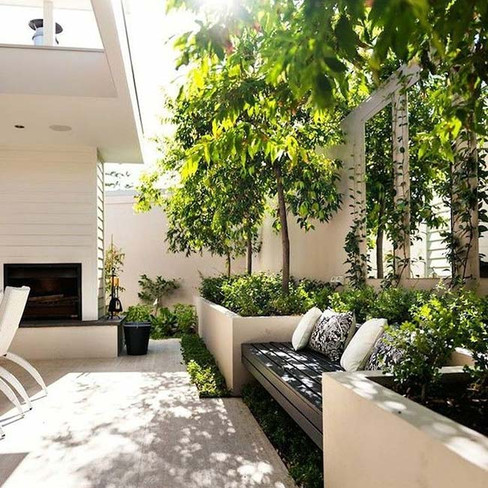 Os canteiros laterais e de canto, próximos às paredes e os muros ficam incríveis, pois deixam a paisagem mais viva, os bancos e mesas também podem ser pensados para ficar nos cantos, com uma iluminação especial para não ocuparem locais mais escuros.