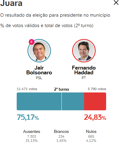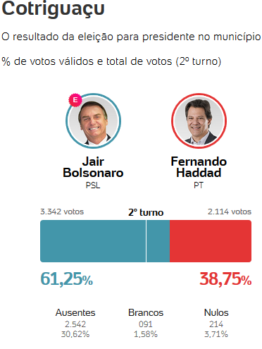 Para conhecimento dos leitores disponibilizamos aqui a imagem do percentual obtido por cada candidato em sua cidade, para assim ter a informação do quanto a tolerância e sensatez, poderá estar presente ou ódio e intolerância poderá presente nas conversas, diálogo e ações, independe da administrações municipais e das ações realizadas pelo seus prefeitos.