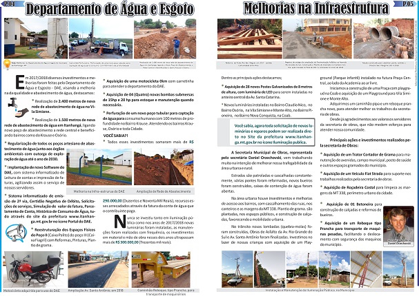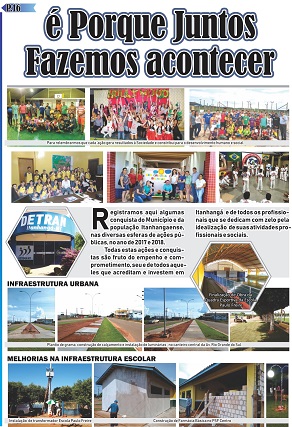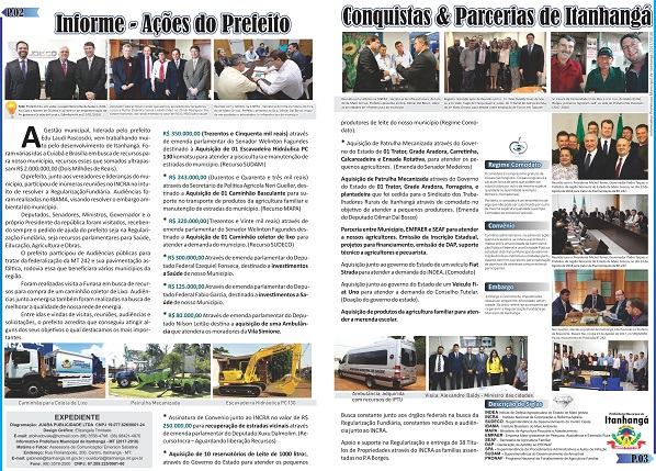 A administração de Itanhangá, colocou em circulação agora no início do ano de 2019 um informativo que trouxe o resumo de todas as ações que a atual administração realizou neste período de 2 anos, as pessoas no município estão recebendo o seu informativo, o qual tem 16 páginas, e os interessados pode acessar as imagens do informativo que foi colocado à disposição dos moradores de Itanhangá, para assim melhorar a sua leitura, ter o registro das ações realizadas e poderem acompanhar o que a administração realizou na localidade.