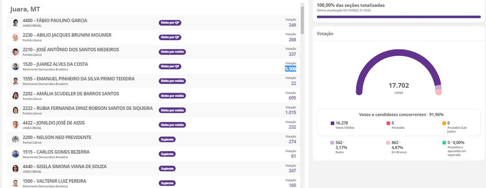 Claro, a região do Vale do Arinos tem menos eleitores do que a região do Vale do Juruena, portanto, o fato dos prefeitos dos municípios do Vale do Arinos ter se engajado na reeleição da deputada Janaina Riva fez uma grande diferença, mesmo com Juara tendo outra candidata a deputada estadual, a vereadora, Sandy de Paula Alves Mainardes (UB) que obteve 5.255 votos na localidade.