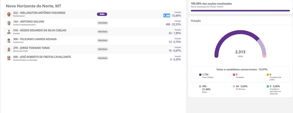 O prefeito de Novo Horizonte do Norte, Silvano Pereira Neves (MDB), também fez campanha para os mesmos candidatos na reeleição, ou seja, Janaina Riva Fagundes (810 votos), Juarez Costa (859 votos), Wellington Fagundes (1.260 votos), Mauro Mendes (1.627 votos) e Bolsonaro (1.384 votos), todos os mais votados pela população na localidade.